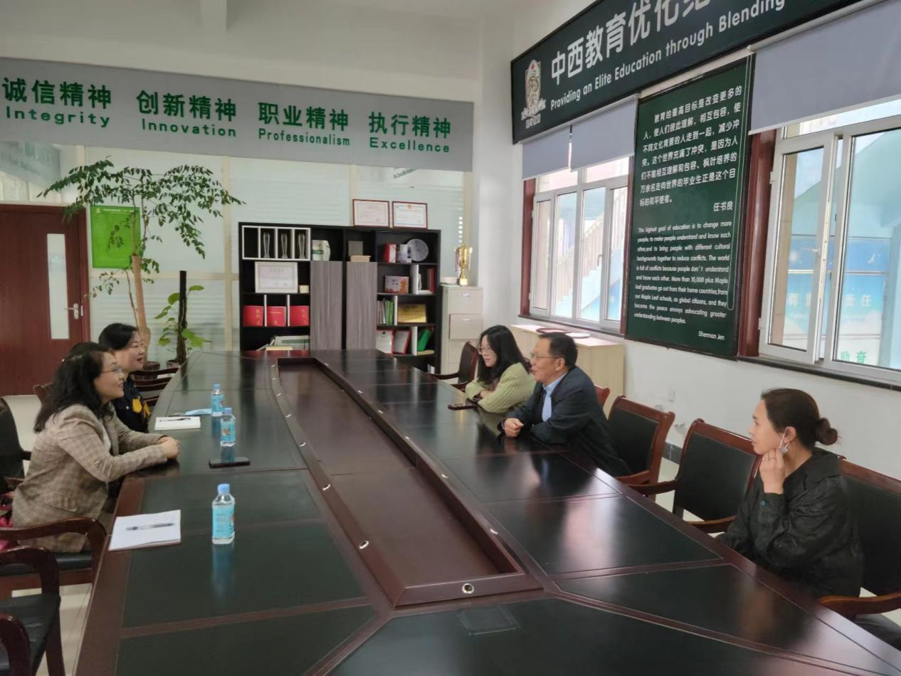枫叶双语学校高中部校长王玉洲先生和初小学校长何丽娟女士向我院领导介绍了已有11年办学历史的镇江枫叶学校的概况,该校秉承中西教育结合,实施素质教育的办学思想,致力于为所有学生提供一流的教育服务。学校实施学分制中英双语教学,学生凭枫叶毕业学分直接升入国内外大学及学院,其学分得到英语国家大学认可。