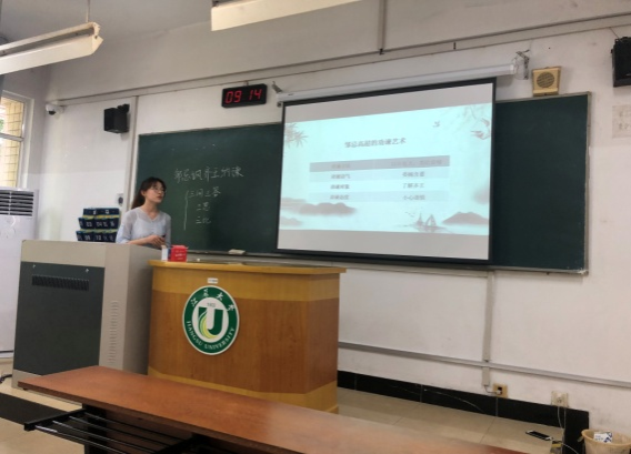 同学们借助多媒体并结合精心设计的板书进行教学展示,讲课结束后,评委老师们给出了宝贵的指导意见与建议。蒋传红老师点明了教材的布局要点,强调文体的重要性,建议同学们注意教材编者的意图,精心设计,把握好课文的重点和切入的视角。周衡老师提出了四个方面的意见:一是有知识,避免硬伤,“一课一得”,在能力的训练中获得认知;二是有重点,教学选点要抓住核心问题、开阔思维;三是有匠心,课程设计要化繁为简、举重若轻;四是有规范,语言表达要准确严谨。徐光萍老师和武克勤老师也分别从教材体系、语言素质、教姿教态、临场发挥、内涵把握、教学拓展等方面提出了建议。