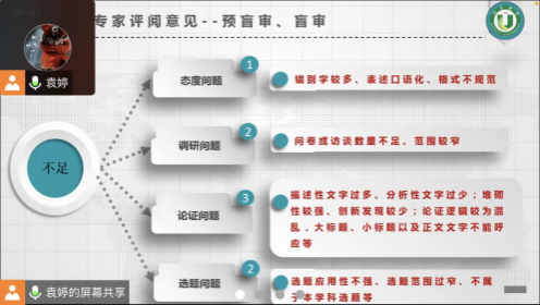 针对学位论文开题,研究生培养中心主任薛晨向大家做了反馈。他分析了开题对于今后研究选题和研究方向的重要意义,并就专家发现的相关问题作了详细说明。这些问题主要包括:态度问题(错别字较多、表述口语化、格式不规范等),调研问题(问卷和访谈不足,范围较窄);写作问题(描述多而分析少,资料堆砌现象明显,论证逻辑较为混乱、创新点不明想等),以及选题问题(包括应用型不强,范围过窄,偏离本学科范畴等)。最后,余红艳副院长对于本年度研究生培养环节中,研究生学位论文写作出现的问题提出了方向性建议,要求同学们主动联系自己的导师,积极寻求导师指导;关注研究生培养的各项关键节点,关注自己的写作进度,按照要求按时、保质完成进度;端正自己的学习态度,克服低级错误,加强写作与学术规范;夯实基础,保证饱满的工作量,进行扎实的基础研究;摒弃学位论文写作过程中的闯关、侥幸心态,认真对待每一个环节,并努力平衡好自己的就业与学业时间,先保证毕业再努力就业。