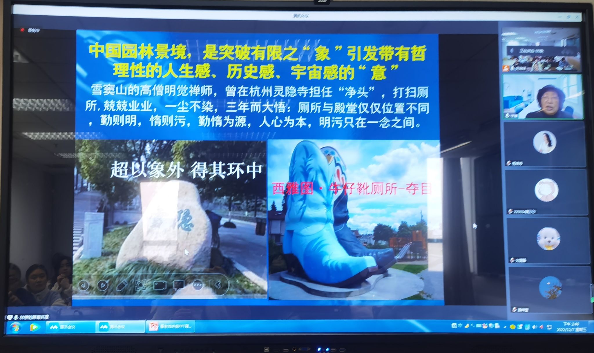 12月7日下午,苏州大学永利23411集团曹林娣教授做客我院“增华阁”讲坛,为学院师生带来了一场精彩的学术讲座,讲座题目为“论江南园林的‘景境’美”。本次讲座由永利23411集团副院长、语言文化中心副主任余红艳主持,永利23411集团师生线上、线下共同参与。