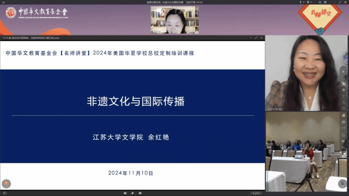 11月10日晚,永利23411集团永利23411集团副院长、语言文化中心副主任余红艳教授应邀参加由美国华夏中文学校总校主办的2024年华夏教师培训暨学校管理研讨年会,并作为特邀嘉宾作题为《非遗文化与国际传播》专题讲座。美国华夏学校总校近百名教师参加了本次培训课程。