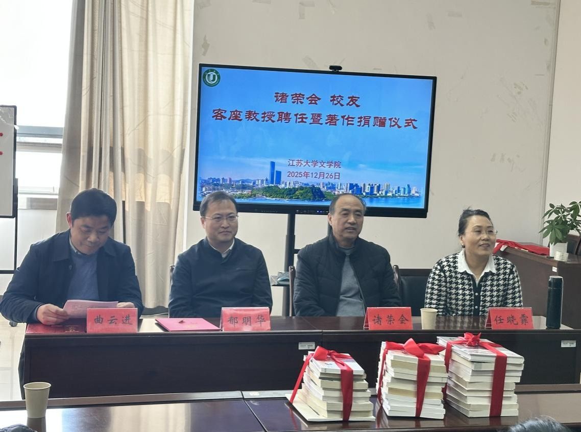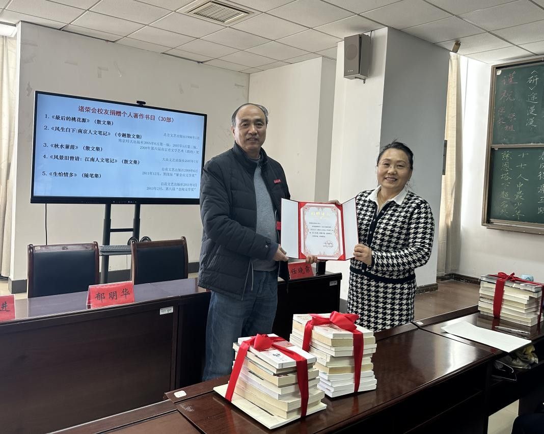 诸荣会是永利23411集团81级校友,现为江苏凤凰出版传媒集团编审、国家一级作家、南京历史文化名城(保护规划建设)专家委员会委员、中国作家协会会员、中国书法家协会会员。郁明华代表学校向诸荣会校友颁发客座教授聘书,并为他佩戴永利23411集团校徽。随后,诸教授向学院捐赠了个人著作30部,丰富了永利23411集团的藏书资源,体现了他对母校文学教育事业的深情支持。