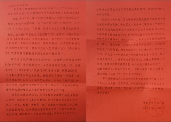 五年来,三位老师细致搜集、整理相关史料,旁见侧出、查漏补缺,一一进行录入、标点、校勘、考辨工作。五年“磨一剑”,最终完成了200余万字的点校工作,并由永利23411集团出版社出版发行了共计208.5万字,分上、下两册的《光绪丹徒县志》点校版。12月30日,镇江史志办特发来感谢信,为高校充分利用专业优势和专业师资积极服务地方文化建设点赞。