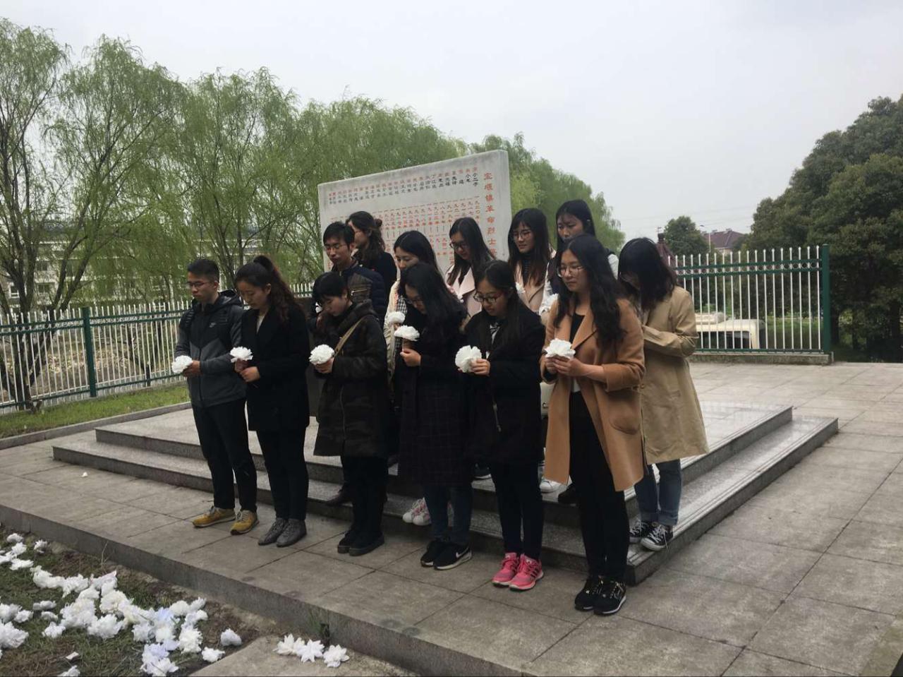 下午1时,大家从五棵松准时出发,来到了具有革命文化积淀的历史旅游胜地——镇江市丹徒区宝堰镇。首先,大家在导游的带领下参观了宝堰镇新四军抗敌纪念总会。纪念馆内的新四军抗敌事迹介绍和珍贵的照片记录,使每一位党员对那一段血雨腥风的战争历史有了进一步的了解;同时,先烈们勇于牺牲的大无畏精神也使在场的每一位同学深深得感动。之后,党支部全体成员前往烈士陵园,瞻仰了烈士碑。烈士碑巍峨地耸立在蔚蓝苍穹之下,大家仿佛感受到了这些英勇烈士的正义凛然、视死如归,顿时,一股崇敬之情油然而生。在纪念碑面前,全体党员雄赳赳、气昂昂地唱起了国歌,一齐抒发对祖国的热爱之情,表达对先烈的感激之心。之后,同学们依次为先烈们献上了小白花,以表达对先烈们的敬意。献花礼毕,大家集体默哀了三分钟。最后,学生代表发言,表达了对烈士的缅怀和建设社会主义的决心。
