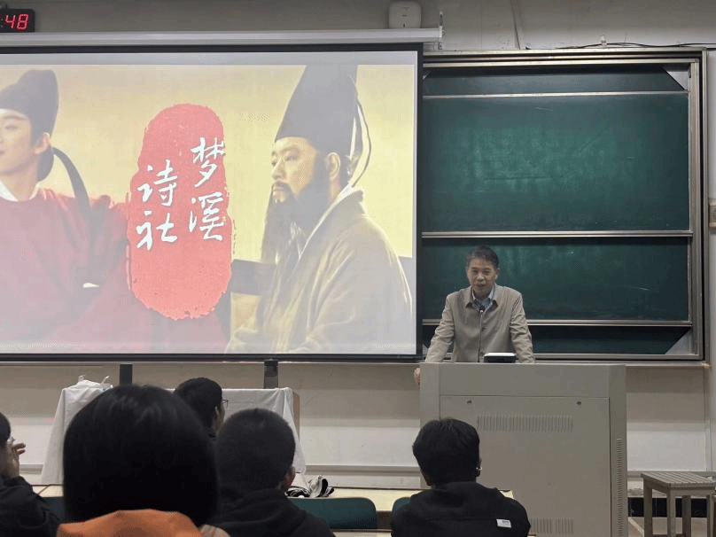 随后,各位老师也表达了对诗社发展的殷殷期盼。指导老师黄湛从专业文学视角,结合自身诗词研究心得发表讲话,对诗社和成员成长提出殷切期望,鼓励大家在诗词的天地中深耕细作,于文学探索中不断成长。特邀嘉宾董国军书记肯定了梦溪诗社在校园文化建设中的积极作用,强调文学社团对提升学生综合素养的重要意义,寄望诗社继续传承文学薪火,为校园文化增添更多诗意光彩。