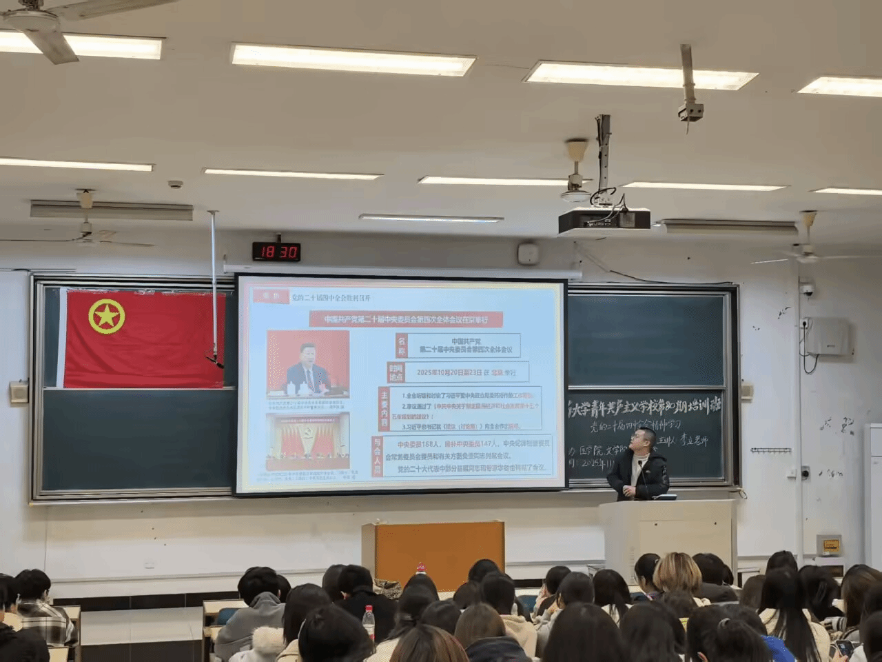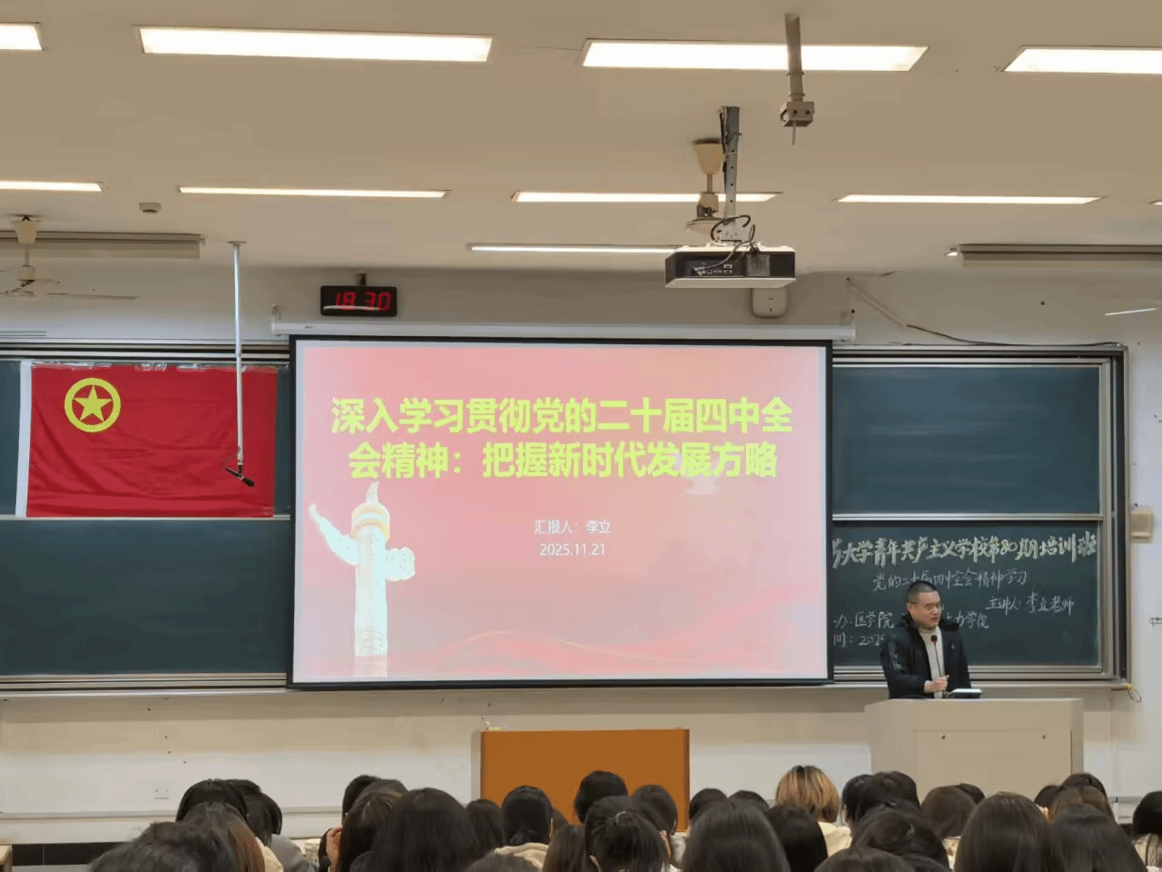 为引导团员青年深入领会党的二十届四中全会精神,筑牢思想根基、勇担时代使命,2025年11月21日下午18时30分,永利23411集团永利23411集团联合医学院、土力学院在讲堂群103举办了以“党的二十届四中全会精神学习”为主题的第80期团校培训班第一讲。本次团课由马克思主义学院李立老师主讲,永利23411集团、医学院和土力学院的班团干部共同参加。