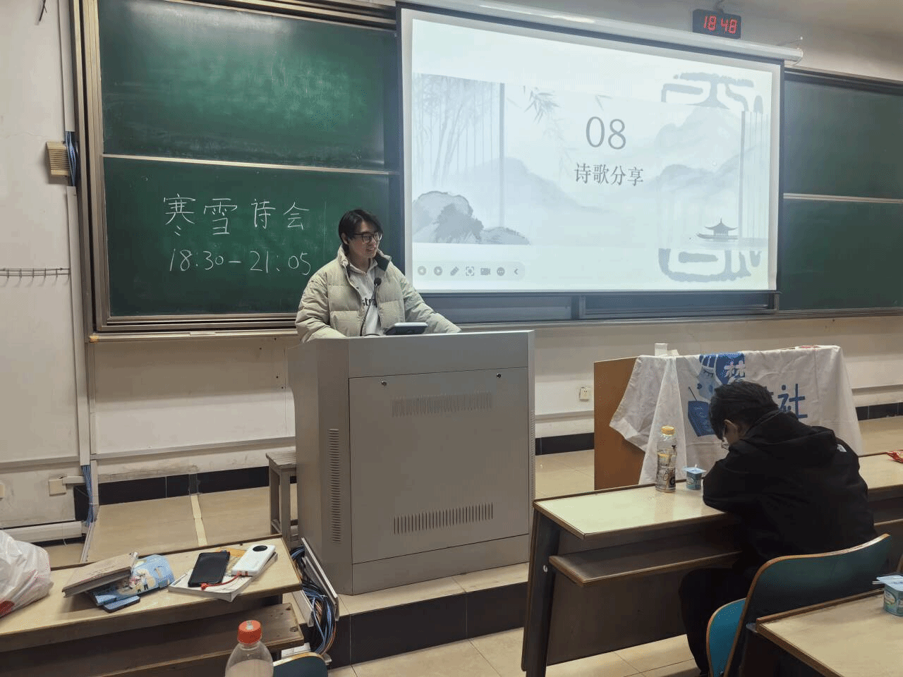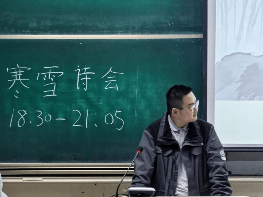 在互动分享环节,现场同学踊跃登台,分享自己喜爱的雪主题诗歌以及感悟。有同学带来了自己原创的雪诗,用略显青涩却真挚的文字描绘校园冬景;也有同学结合生活体验,解读诗歌中蕴含的人生哲理,让诗会在思想的碰撞中更具感染力。随后的有奖问答环节更是将气氛推向高潮,题目涵盖诗词作者、典故出处、文学常识等多个方面,从屈原的作品辨识到辛弃疾的相和词,从《诗经》的“三颂”到外国文学名著,同学们沉着应答、积极抢答,展现了江大学子扎实的文学素养。答对题目者获得了诗社精心准备的经典诗词集,让大家在趣味互动中收获知识与喜悦。