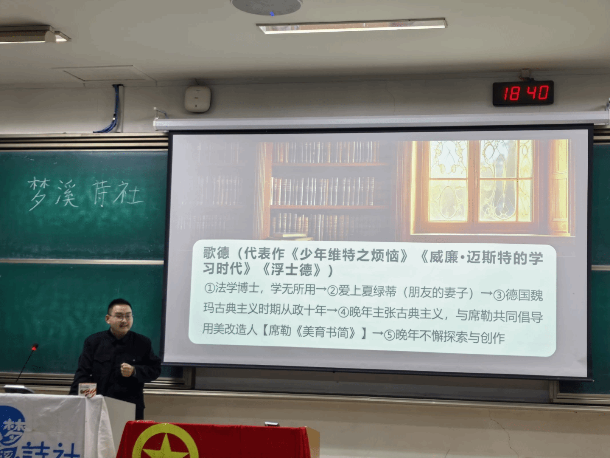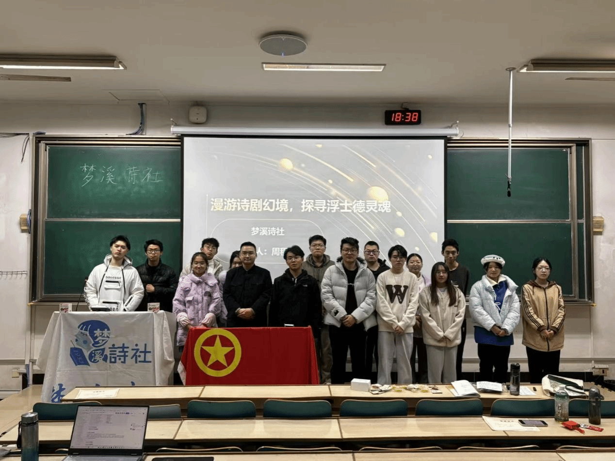 凭借周程成清晰的脉络讲解、深刻的内容分析,社员与文学爱好者走进了这部诗剧的奇幻世界,一同探寻了浮士德的灵魂求索之路。本次活动不仅让同学们领略了经典文学的艺术魅力与思想深度,还搭建了一个交流感悟、启迪思考的平台。梦溪诗社未来也将持续挖掘经典文学的当代价值、举办更多的文学活动,让经典作品滋养青年的心灵,引导同学们秉持“铅刀贵一割,梦想骋良图”的信念,在追求理想的征程中坚定前行、永不言弃。