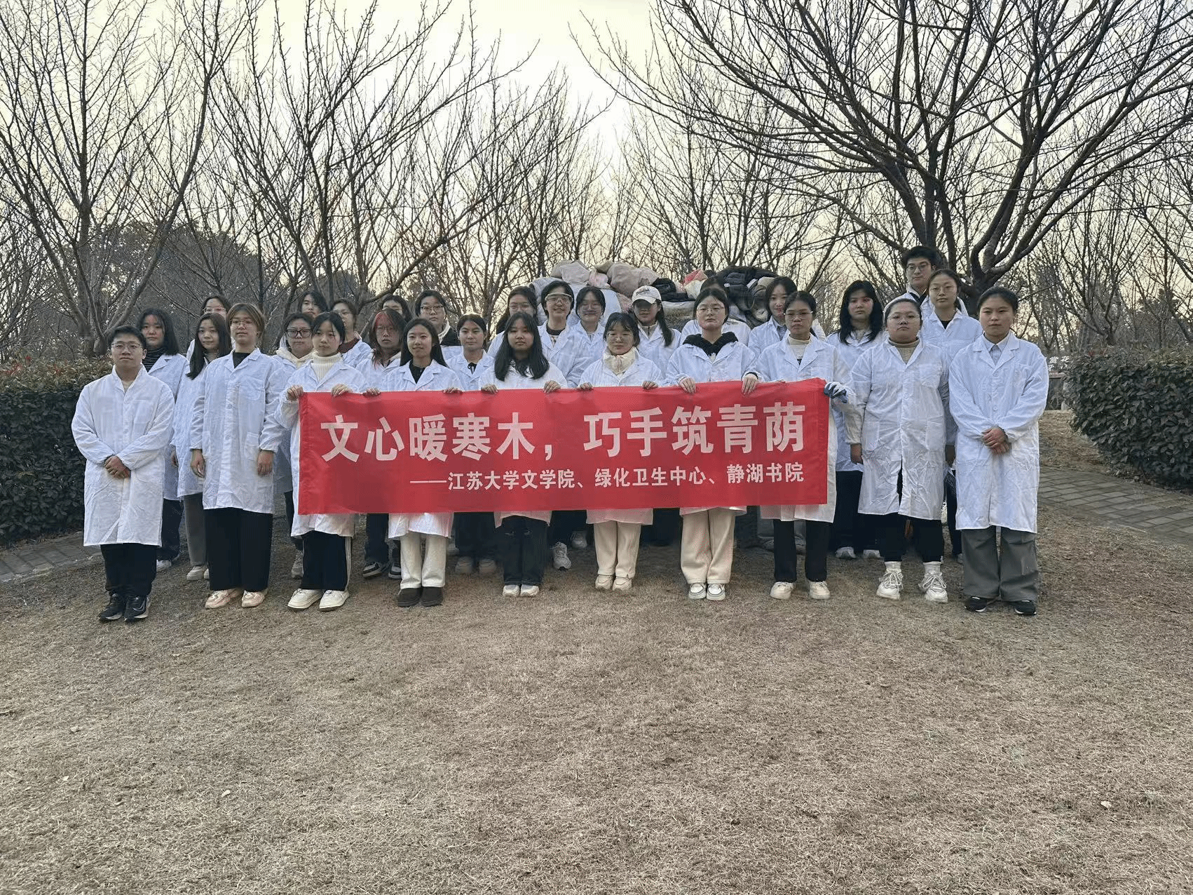 经过近两个小时的共同努力,友谊樱花园内众多樱花树相继披上了整齐的白色“防护冬衣”,静待春归。此次活动不仅为校园树木提供了实实在在的物理防护,更在同学们心中播下了热爱自然、爱护校园、崇尚劳动的种子。今后,永利23411集团将持续探索实践育人路径,将人文精神融入具体行动,引导学子以“巧手”筑就盎然“青荫”,为建设更美丽、更富人文气息的校园环境贡献青春力量。