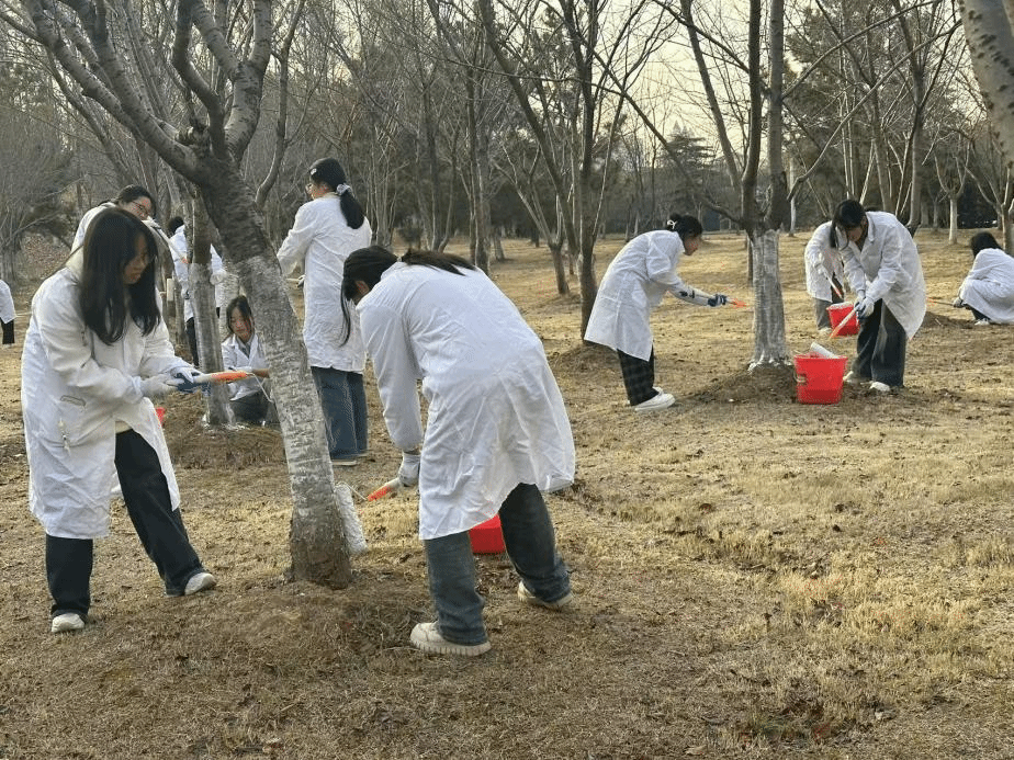 时值深冬,气温渐低,树木进入养护关键期。刷涂专用防护漆能有效帮助树木抵御低温冻害、防止病虫害侵袭,确保其安全越冬,翌年焕发生机。活动现场,同学们以小组为单位,手持刷具,细心搅拌涂料,在认真听取绿卫同学讲解技术要点后,便投入工作。他们弯腰俯身,仔细地将白色防护漆均匀涂抹在樱花树的主干及主要枝杈上,动作逐渐熟练。白色漆料与同学们的身影相互映衬,成为冬日校园里一道亮丽而温馨的风景线。