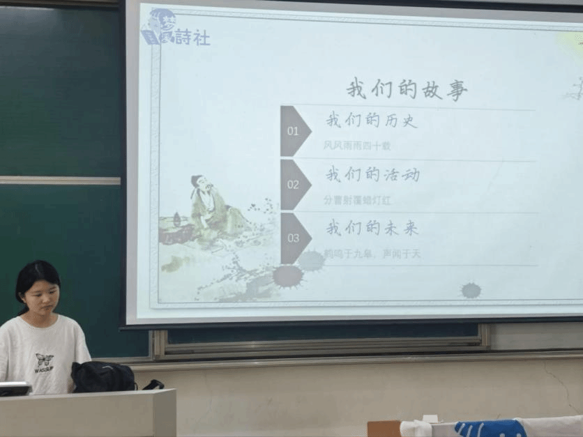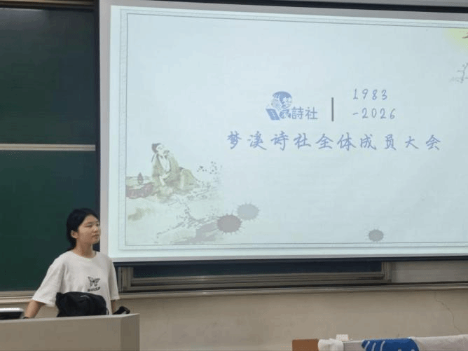 首先,主持人张米妮致开场词,介绍大会宗旨与流程。诗社负责人对新成员表示了热烈欢迎,并系统介绍了社团历史、活动体系与发展规划,阐释了以诗会友、以情聚力的社团文化,鼓励社员在诗词学习与创作中提升自我、收获成长。接着,由指导老师从文学专业角度发表致辞,分享诗词研究心得,寄语社员坚守文学初心,深耕经典品读与原创创作,在诗词世界中涵养人文情怀、传承中华文脉。最后,在新老成员交流环节中,新成员依次自我介绍,分享文学喜好与入社期待。老成员代表分享社团经历、创作经验与学习心得,为新成员提供参考与启发。